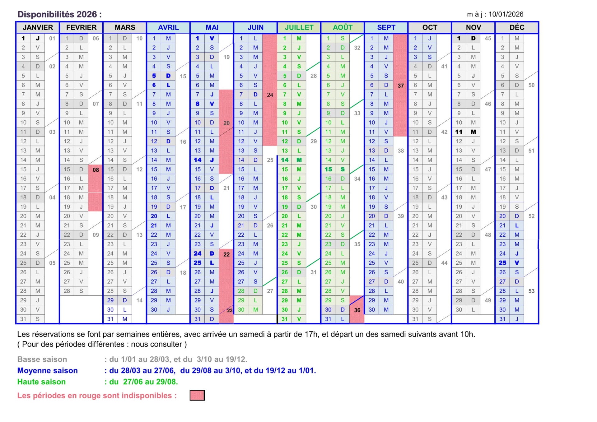 01/01 au 28/03 - 03/10 au 19/12